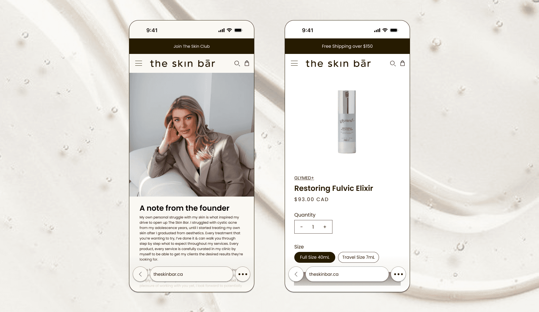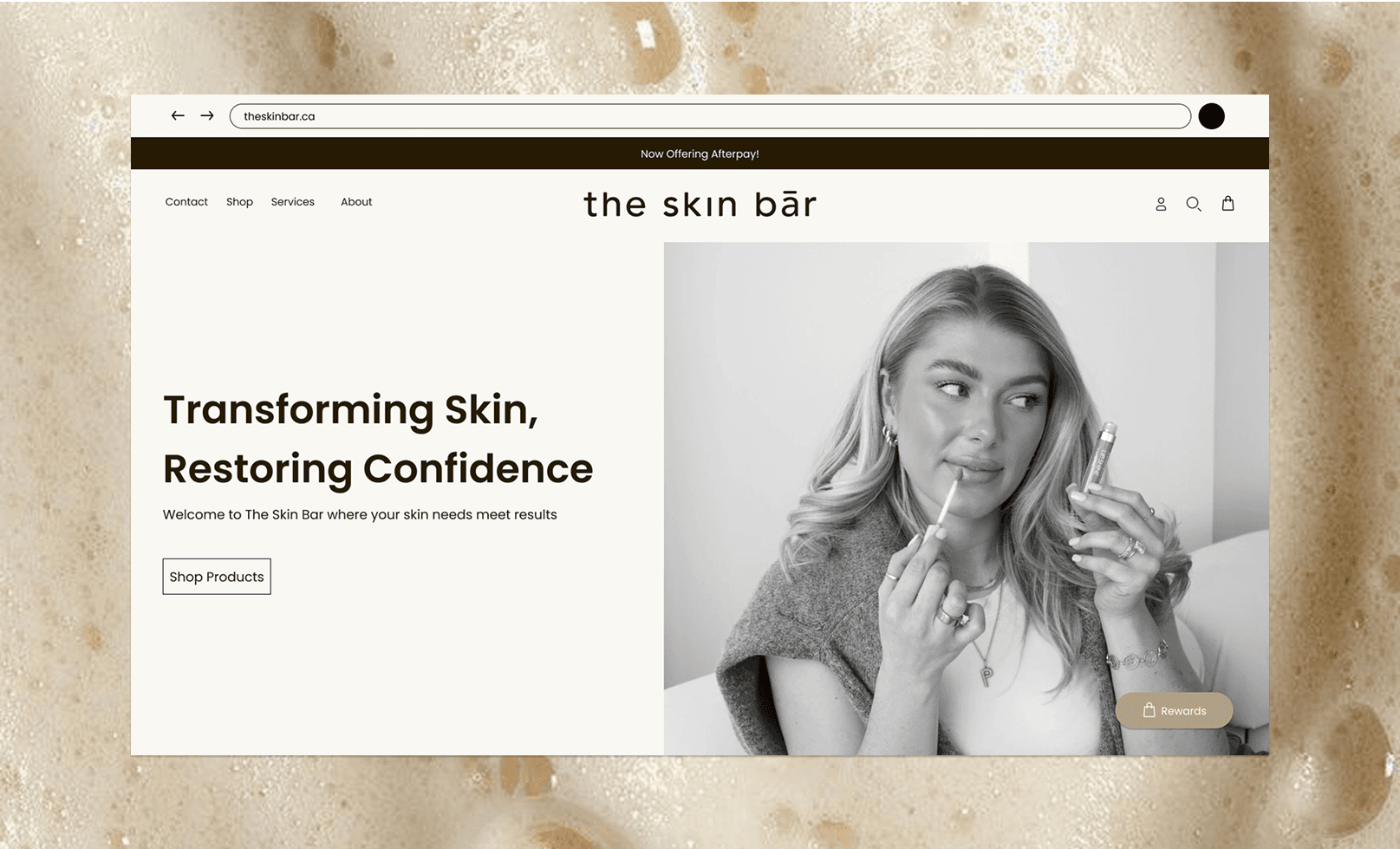 A complete rebrand for The Skin Bar, from visual identity to digital experience. A custom Shopify website, integrated loyalty program, and cohesive brand system built stronger customer relationships and created a seamless experience for clients—online and in-clinic.